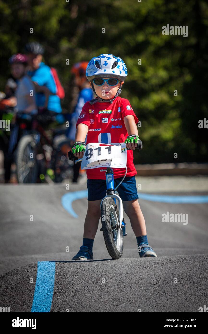 2 3 Year Old Kid On Kick Bike With Sunglasses And Helmet At A Bike Park Pump Track Stock Photo Alamy